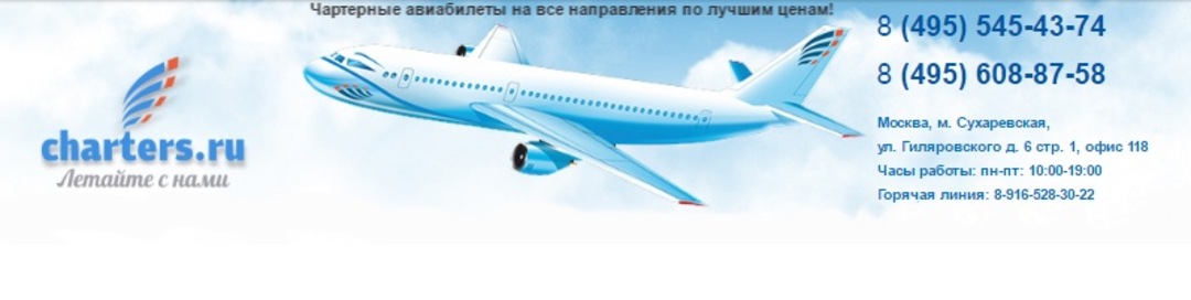 Компания ООО «Чартерпан» предоставляет услуги по бронированию и приобретению авиабилетов на чартерные рейсы. Продажа билетов осуществляется на чартерные перелёты из Москвы. Имея большой опыт работы на туристическом рынке, мы предлагаем нашим клиентам максимально возможные и наиболее оптимальные варианты перелётов на чартерах. Мы работаем с крупными туроператорами и консолидаторами чартерных рейсов, что позволяет нам предлагать пассажирам наиболее выгодные цены на авиабилеты. Мы понимаем, что авиаперелёт является важной составляющей отдыха наших клиентов, поэтому к каждому заказу мы относим с максимальным вниманием. Кроме того, мы предлагаем нашим клиентам полисы страхования туристов на время поездки.